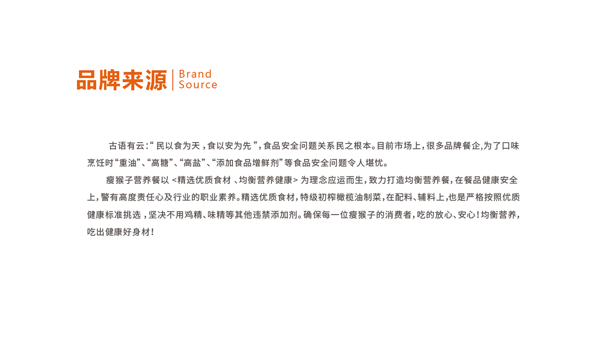 瘦猴子品牌是針對白領打造的均衡營養餐, 精選上乘原料, 健康品質保證,瘦猴子均衡營養餐 - 均衡營養 品質生活,品牌視覺設計上主要體現簡約時尚、年輕化、親和力的形象風格。