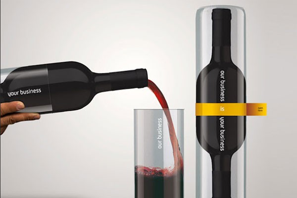 仔細(xì)賞析一下這組案例,第一幅作品是將酒瓶設(shè)計(jì)成棒槌形狀,并且在外面設(shè)計(jì)了一個(gè)外玻璃罩,透明、磨砂材質(zhì)讓消費(fèi)者一眼就能看出酒的內(nèi)在品質(zhì)。