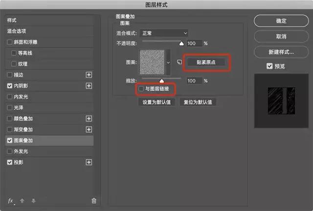 在Photoshop中返回原始文檔,然后再次選擇第一個文本圖層。使用剛才創建的圖案添加圖案疊加。取消選擇與圖層鏈接,然后單擊貼緊原點。