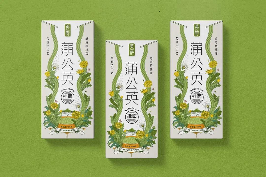 榮獲麗水山耕包裝設(shè)計(jì)獎(jiǎng)的掛面品牌,以蒲公英為設(shè)計(jì)主題,清新質(zhì)樸的設(shè)計(jì)元素,完美呈現(xiàn)天然健康的產(chǎn)品理念。其中的插畫設(shè)計(jì)是尤為出彩的地方,使用場(chǎng)景設(shè)定的方式,自然地融合蒲公英和面條兩大元素,直觀表達(dá)出產(chǎn)品的特性。插畫中設(shè)計(jì)有盛著掛面的碗,從兩側(cè)延伸出細(xì)長柔軟的綠色掛面,而蒲公英則圍繞在面條周圍,蜜蜂與蝴蝶的點(diǎn)綴搭配山巒田園美景,使得包裝充滿活力生機(jī)的大自然氣息。