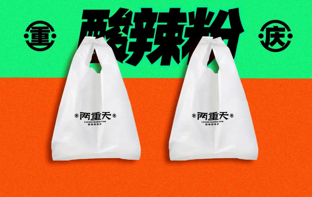 這個酸辣粉的品牌LOGO,是簡潔的幾個字體組成,用排版順序的重次增加視覺效果。而Slogan“酸辣兩重天,爽滑在人間”,表層字眼的文案,有著“簡單粗暴”的勁爽。