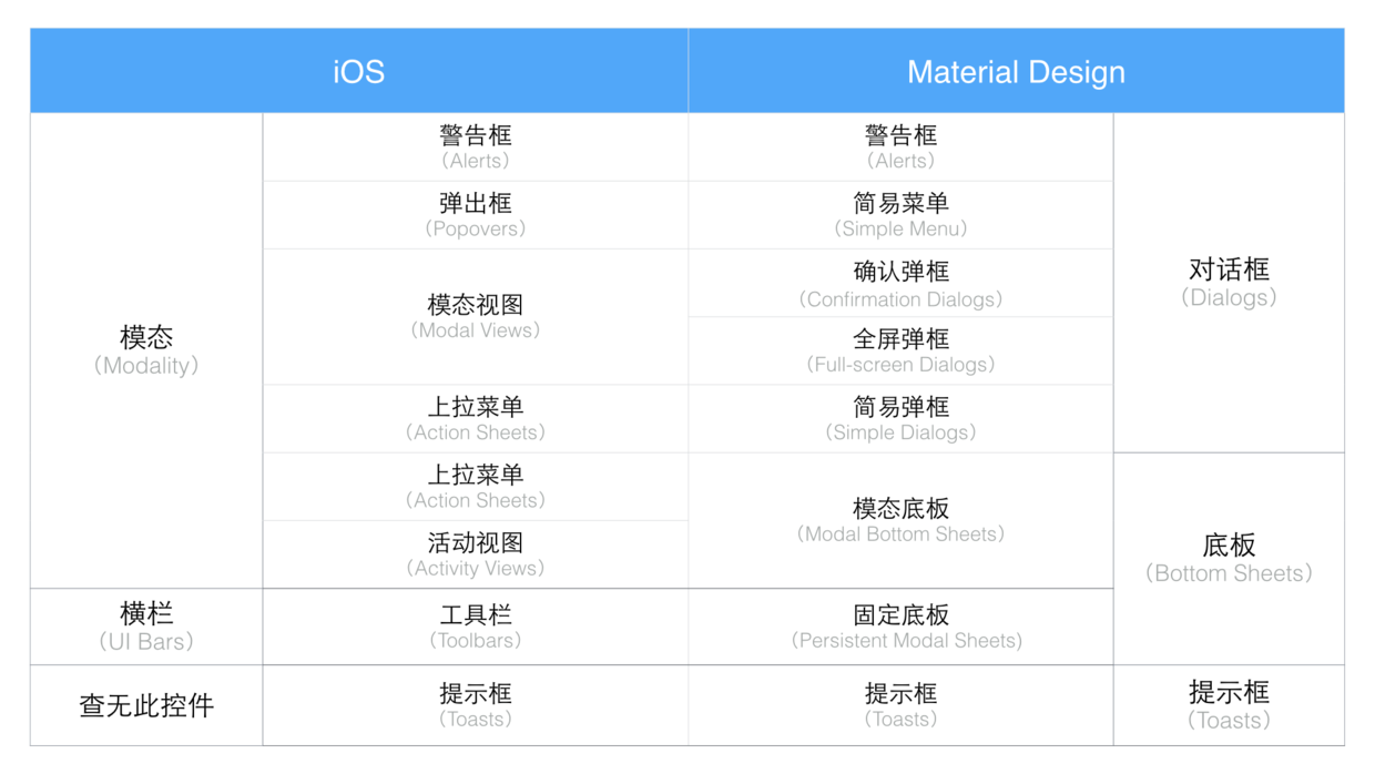 在Material Design(簡稱為MD,下同)中,沒有與模態相對應的概念。但其實,對話框和底板(除了固定底板),構成的也是模態的體驗。