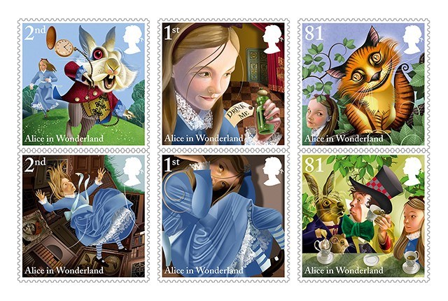 為慶祝英國作家劉易斯·卡羅爾(Lewis Caroll)的童話出版150周年,英國皇家郵政與著名插畫家Grahame Baker-Smith合作,圍繞著《愛麗絲夢游仙境》中的主要角色(如愛麗絲、白兔先生等)和經典場景,繪制了10幅郵票。蘇州插畫設計