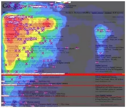 在谷歌搜索頁面,前五個搜索結果獲得的“眼球”最多。紅線代表你必須滾動鼠標翻頁了。