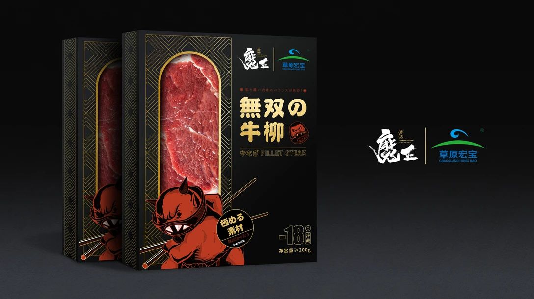 這個(gè)叫魔王無(wú)雙的日料品牌,進(jìn)行了品牌升級(jí),這次的升級(jí)部分是VI和空間,VI部分主要是圍繞IP插畫展開。因?yàn)槠放泼心鯚o(wú)雙,所以在打造符合品牌名的IP時(shí),就塑造了魔王這一個(gè)IP形象,一提起魔王,大家就會(huì)率先想到牛魔王,所以IP形象實(shí)際上是借用了牛魔王這一眾多周知的經(jīng)典形象。通體棕紅的魔王身著日本相撲出場(chǎng)時(shí)所穿的兜擋布,日料的氣息一下子就出來(lái)了。只不過(guò)魔王身上的是鎧甲兜擋布,和面具和牛角一致,面具上所畫的表情有點(diǎn)齜牙咧嘴,看起來(lái)不好惹的樣子,魔王的眉眼皺在一起,眼神堅(jiān)定,加上手里拿著武器,很像要挑戰(zhàn)別人,還堅(jiān)信自己會(huì)贏的武士。但魔王又是日料廚師,做著烤肉加料理的動(dòng)作,兇颯的表情也變得憨了起來(lái)。而由于是日料品牌,品牌設(shè)計(jì)上也采用了很多日本的元素。如浮世繪風(fēng)格的海浪,超大顏色鮮明的字帖、漫畫版式宣傳畫報(bào)等等。整體搭配很有日式漫畫的特點(diǎn),IP形象搭配不同的食材做出不同的表情動(dòng)作,非常豐滿立體,這樣的宣傳畫報(bào)也能在第一瞬間吸引人的注意,從而為門店帶來(lái)更多的消費(fèi)者。海報(bào)設(shè)計(jì)采取左右分布法則,左邊為字體部分,右邊為插畫部分。字體部分橫版分布,通過(guò)加粗突出品牌的經(jīng)營(yíng)優(yōu)勢(shì),插畫部分是一只被拆解的魚,又通過(guò)魔王、海浪、火山等元素形成一只不那么貼緊的魚,趣味性不足。