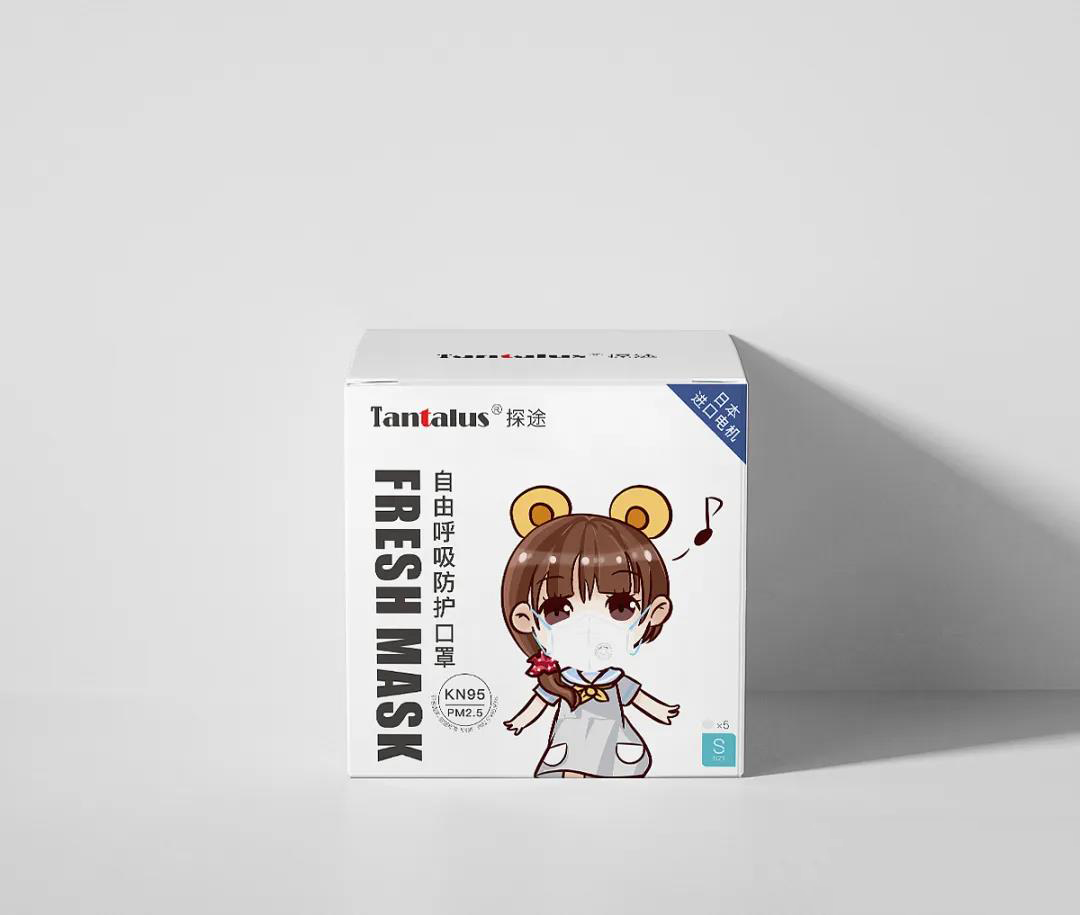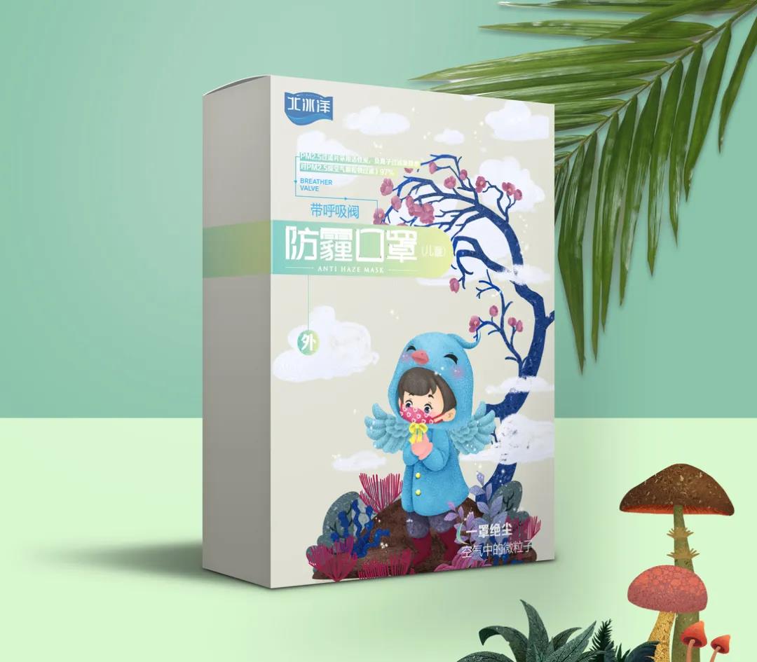 這款包裝乍一看以為只是簡單的IP形象,但在其身后加入了翅膀的插畫設計,通過擬物化手法進行創意描繪,在口罩設計上擁有自己的區分亮點。