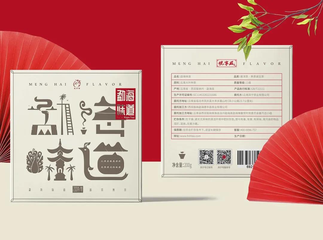 這款勐海味道茶葉包裝,整體以米色調(diào)進(jìn)行畫面鋪設(shè),封面的字體設(shè)計,巧妙融入了當(dāng)?shù)氐慕ㄖ⒖兹浮釒е参锏龋癸@茶品名稱的同時,使得畫面表達(dá)更具美感。