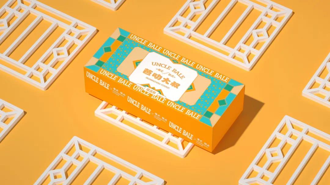 這款糕點采用高飽和度的暖色調設計,輔以封面中的幾何圖形撞色搭配,扁平化的形式勾勒了經典窗格的紋路元素,視覺上更具異域風情。居中排版的LOGO以徽標呈現,金色描邊搭配趣味的中英文字體設計,平衡整體視覺美感的同時,增強消費者對產品的好奇心理。